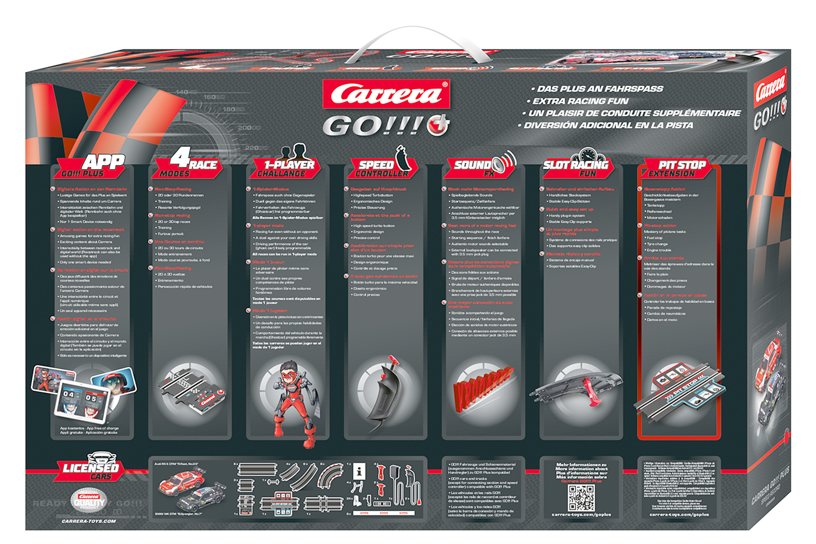 Zwischen einem Looping, einem Fly-Over und einer Kreuzung kannst Du auf der 6,8 Meter langen Rennstrecke richtig Gas geben. Neben den Soundeffekten sorgen die Pit-Stop-Games für Abwechslung, wenn die Slotcars im Maßstab 1:43 in der Boxengasse sind. Die Schienen der Carrera GO!!! Plus Rennbahn sind im Maßstab 1:43 und kompatibel mit dem Material der Carrera GO!!! Variante. Ob im Training, im Rennen, bei der Verfolgungsjagd oder im Ghost-Modus: Diese Rennstrecke liefert bei einer Aufbaumaße von 215 x 128 cm ultimativen Fahrspaß. Beste Rennaction aus der beliebten Rennserie DTM erwartet alle große und kleinen Fans im Wohn- und Kinderzimmer. Im BMW M4 DTM "B.Spengler, No.7" tritt der DTM Sieger von 2012 gegen den Audi RS 5 "R.Rast, No.33" gegen den Champion der vergangenen Saison 2017 an. Die beiden Kontrahenten müssen in diesem Duell alles geben. Auf der 6,8 Meter langen Strecke haben die beiden Champions genug Zeit, ihre volle Geschwindigkeit unter Beweis zu stellen. Kreuzung, Looping und Fly-Over sorgen dabei für noch mehr Spannung. Die Carrera GO!!! Plus App und das Pit Stop Game bringen zusätzliche Rennaction ins Kinderzimmer.